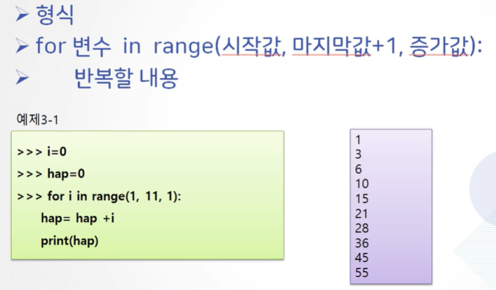 파이썬에서는 반복문 내 옵션의 위치를 이미 시작값, 마지막값+1, 증가값의 형태로 가지고 있어서